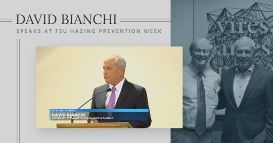 Attorney David Bianchi was recently invited to be a guest speaker during Florida State University’s 2018 Hazing Prevention Week. Mr. Bianchi gave the keynote speech on the legal implications of hazing. Currently, Mr. Bianchi and the team from Stewart Tilghman Fox Bianchi & Cain, P.A. are representing the family of two FSU students who were victims of hazing. Andrew Coffey was killed last November from alcohol poisoning while pledging Pi Kappa Phi. In response to Coffey’s death, Florida State President John Thrasher suspended all Greek life activities on campus. Shortly after the suspension was lifted, Nicholas Mauricio suffered serious brain injuries after he was struck in the face during Alpha Epsilon Pi’s annual “Scumbag of the Week” tradition.